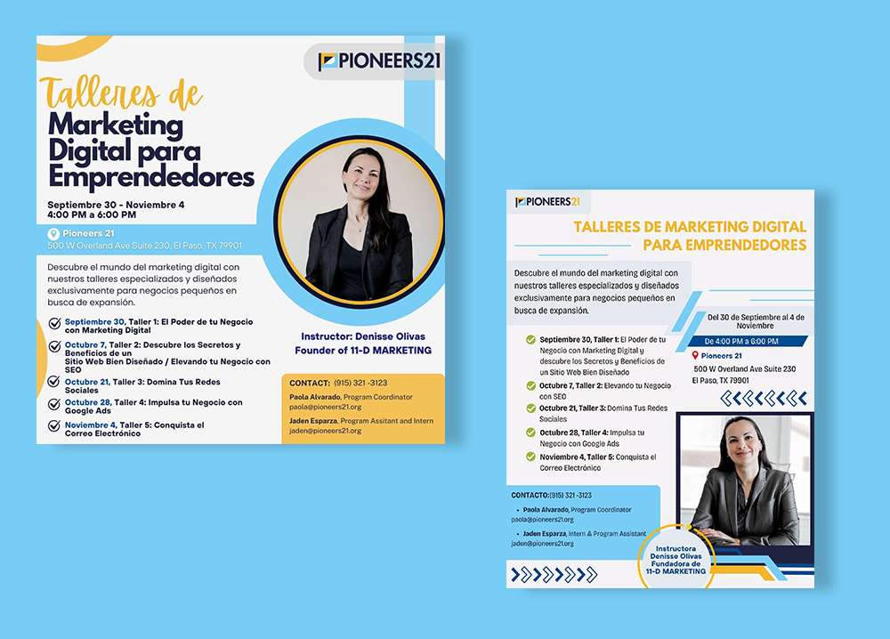 For two years, 11-D Marketing proudly supported Pioneers 21 in strengthening El Paso’s entrepreneurial ecosystem through hands-on digital marketing education and real-world implementation. Through a structured five-session training series delivered six times, we helped more than 200 entrepreneurs deepen their understanding of online marketing and build practical skills to grow their businesses.